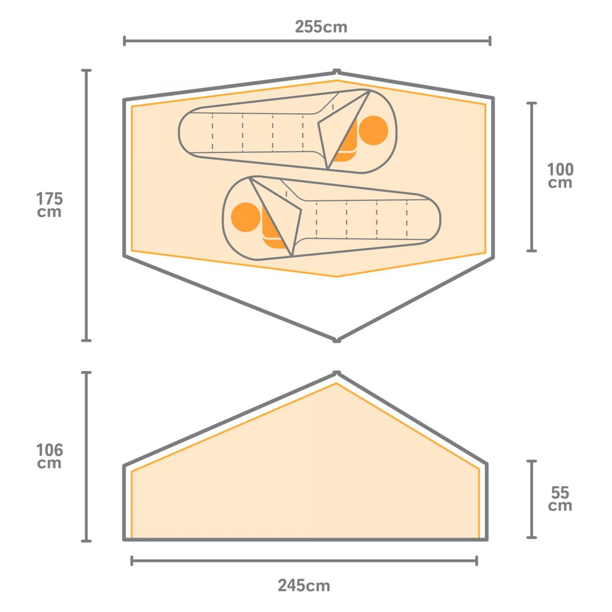 Cort tip tunel pentru 2 persoane, prevazut cu un mic vestibul si orificii de ventilare.